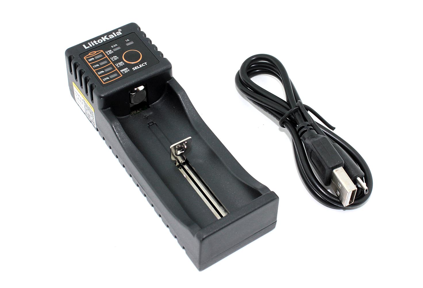Имеет LED-индикаторы, отображающие процесс заряда 25%-50%-75%-100% и тип аккумулятора (1.2V Ni-MH, 3.7V Li-ion, 3.2V Li-Fe, 3.85V Li-ion).
